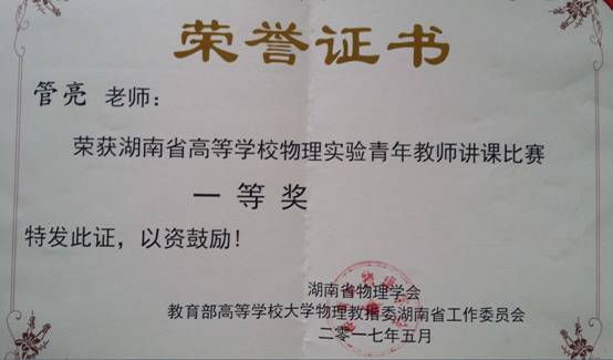 湖南省高等公司物理实验课程青年教师讲课比赛暨全国高等公司物理实验课程青年教师讲课比赛预选赛于2017年5月6日在中南大学物理与电子公司举行,SUNBET申博体育选手管亮老师脱颖而出,以大比分优势获得湖南省一等奖第一名,并被推荐参加2017年7月20日在广西师范大学举行的中南地区复赛。