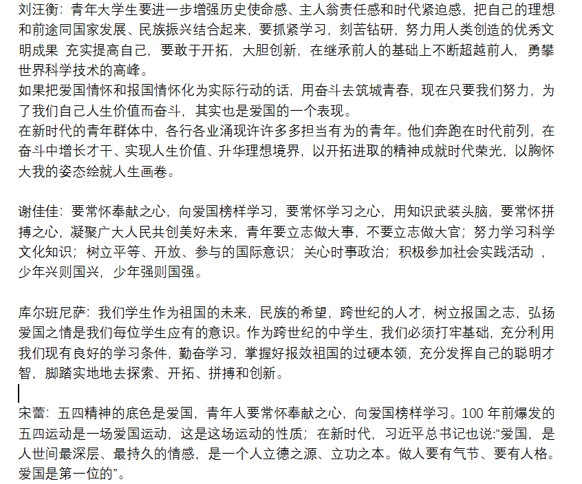 青年兴,则国家兴;青年强,则国家强。相信团员们对自己的责任与未来有了新的想法,目标更加坚定,对五四精神的理解也更加透彻,希望大家的未来会朝着更好的方向发展,将五四精神贯彻在日常生活中,许下青春的诺言,用行动为国奋斗,高举爱国主义的伟大旗帜,毫不畏惧面对一切艰难险阻,在披荆斩棘中开辟新天地,用青春和汗水创造让世界刮目相看的奇迹,青春心向党,建功新时代!