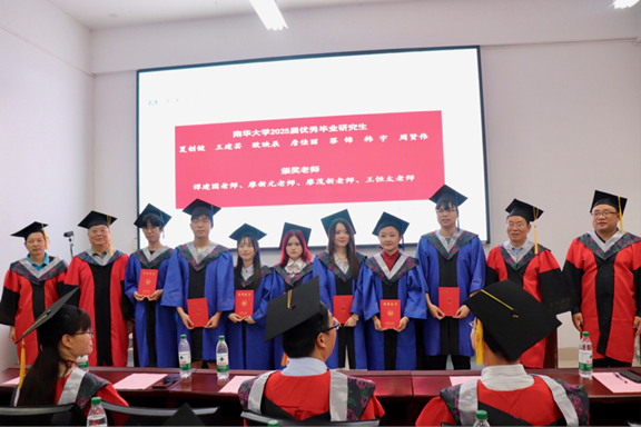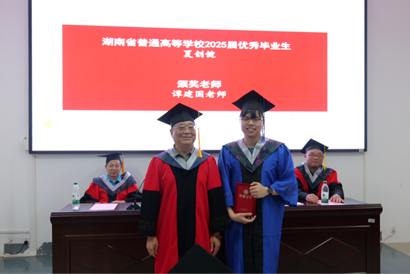 典礼上,研究生辅导员吴庆林老师宣读了优秀毕业研究生表彰名单。夏创健同学荣获“湖南省普通高等公司2025届优秀毕业生”荣誉称号,公司党委书记谭建国为其颁奖;夏创健、王建芸、欧映辰、詹佳丽、蔡锦、韩宇、周贤伟共7名同学荣获“SUNBET体育优秀毕业生”荣誉称号。谭建国老师、欧阳自根老师、廖茂新老师、王恒太老师共同为优秀学子们颁发证书。他们的卓越表现,为在校生树立了学习的标杆。