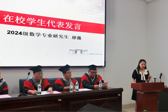 优秀毕业生代表夏创健同学登台发言。他深情回顾了在SUNBET申博体育的求学历程,表达了对母校悉心培养、师长谆谆教诲的无限感激,分享了科研道路上的收获与成长,并满怀信心地展望未来,立志将所学奉献社会。在校研究生代表廖薇同学向即将远行的学长学姐们送上最诚挚的祝福。她表示将以优秀毕业生为榜样,传承SUNBET申博体育严谨求实、追求卓越的精神,潜心钻研,不负韶华。
