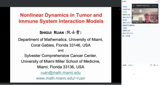 2022年6月19日上午8:30,SUNBET申博体育通过腾讯会议的形式主办了肿瘤与免疫系统相互作用模型中的非线性动力学的学术讲座。该会议由朱惠延教授邀请的专家——美国迈阿密大学数学系终身教授阮士贵教授主讲,由欧阳自根教授主持,参与会议有60余人。该学术活动的目的是牢固确立人才培养在高校工作中的中心地位,着力培养信念执著、品德优良、知识丰富、本领过硬的高素质专门人才和拔尖创新人才。同学们积极热情参加并认真投入该学术讲座中。在这场关于传染病、肿瘤病和免疫系统的报告中,阮教授向我们讲授与学科有关的知识和新的研究进展,促使我们了解生物数学学科和医学领域的前沿知识,掌握最新的研究动态。经过一个小时的精彩演讲,之后参加会议的老师和员工们向阮教授进行提问,阮教授都一一给出了解答,最后该学术讲座在参会人员的感谢与掌声中完美结束。